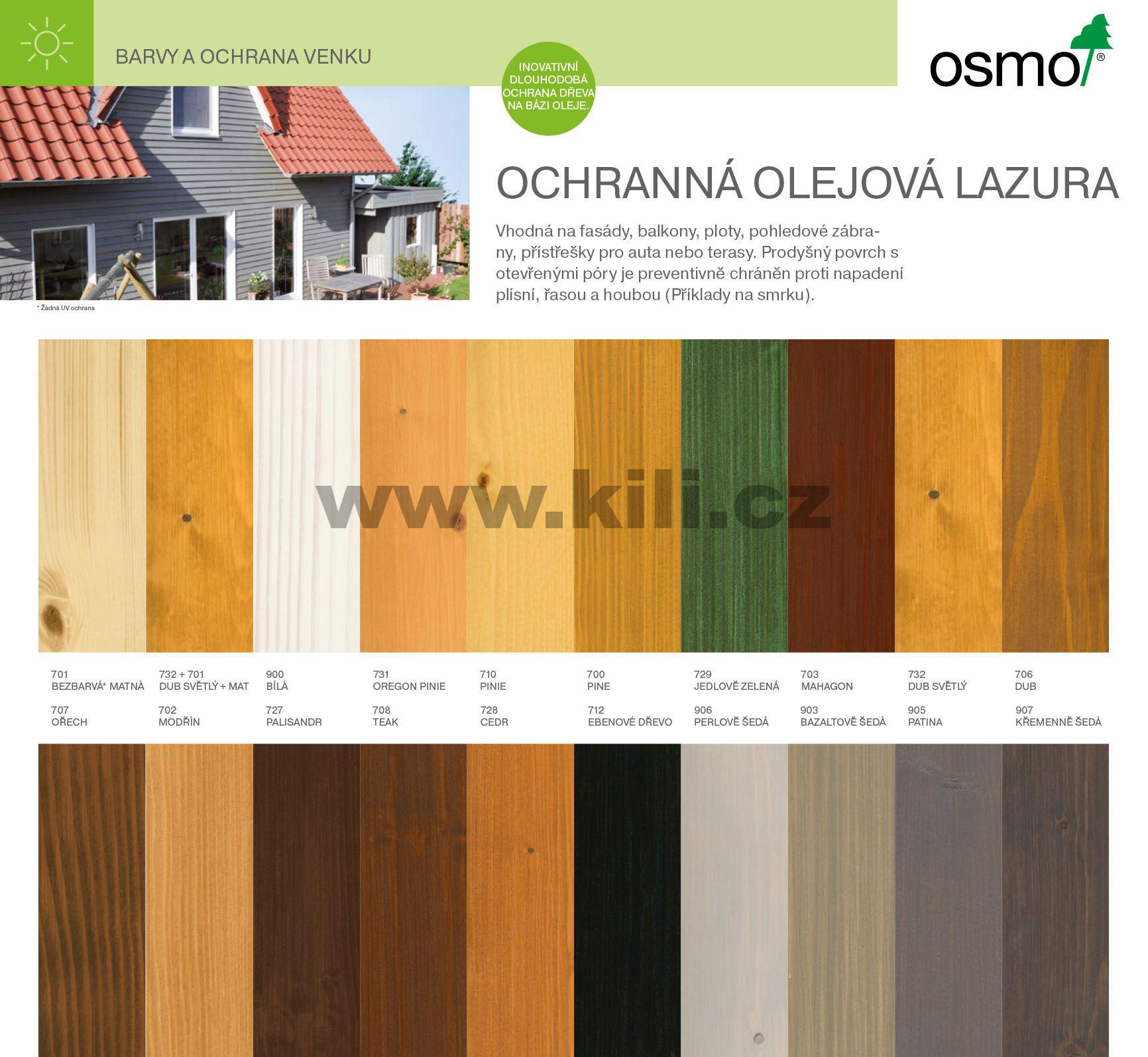 Ochranná olejová lazura č. 701 je matný samostatný nátěr pro svislé chráněné venkovní konstrukce jako jsou střešní podhledy, přístřešky na auta nebo opláštění budov. Osmo Ochranná olejová lazura 701 bezbarvá neposkytuje žádnou ochranu proti UV záření, a proto není doporučována pro aplikace na přímém slunci Je taktéž vhodná jako bezbarvý, matný vrchní nátěr (pouze pro svislé plochy) na barevné Osmo venkovní vrchní nátěry jako jsou Osmo Selská barva, Osmo Ochranná olejová lazura nebo Osmo Jednorázová lazura HS plus. Docílíte tím dodatečného přírodního matného vzhledu povrchu.