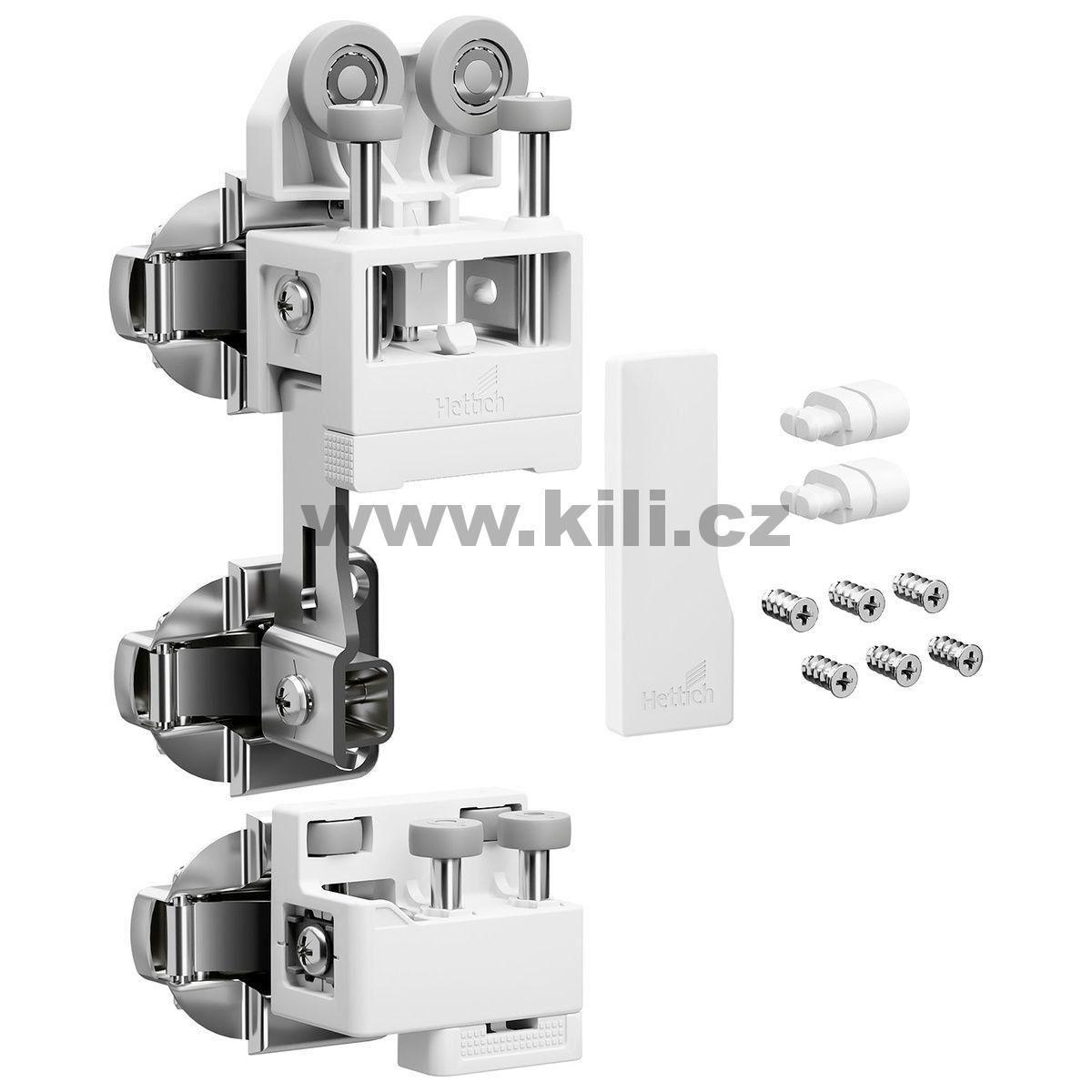 • Sada obsahuje díly pro dveře se 2 křídly: vozík s dvojitým závěsem, vodicí díl k montáži pod dno, krytku a spojovací materiál