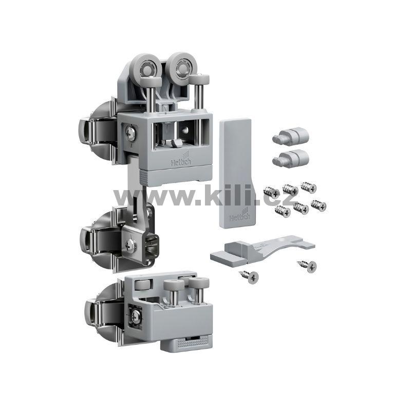 • Sada obsahuje díly pro dveře se 2 křídly: vozík s dvojitým závěsem, vodicí díl k montáži pod dno, krytku a spojovací materiál