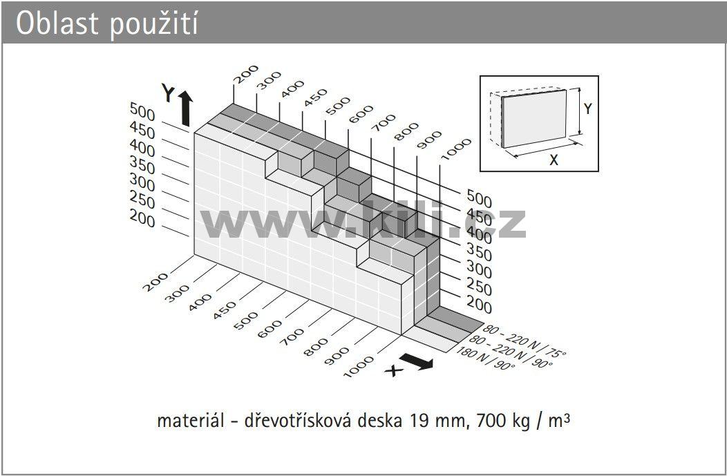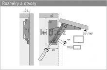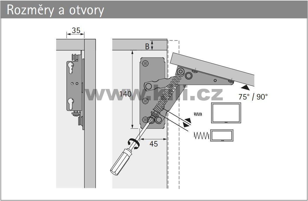Odkaz na stránky výrobce: Výklopné kování Lift 90, nosnost 4,6 kg, s pružinu lze seřídit od 80 N do 220 N, sada L+P