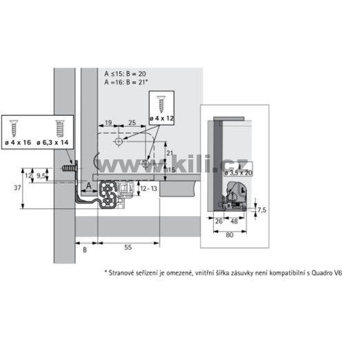 Stranové seřízení: +/- 1,5 mm (tloušťka boků zásuvky max. 15 mm),