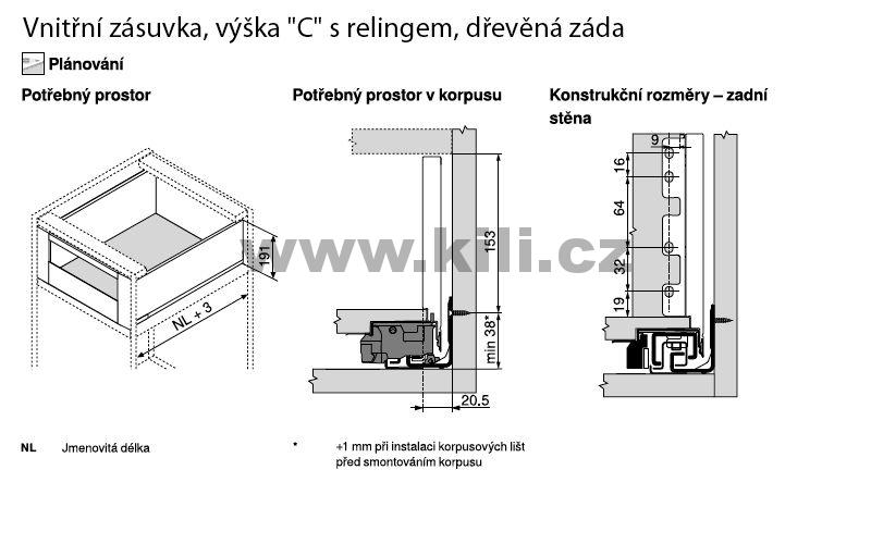 Kompletní vnitřní zásuvka LEGRABOX černá "C" s relingem 500 mm 40 kg s tlumením