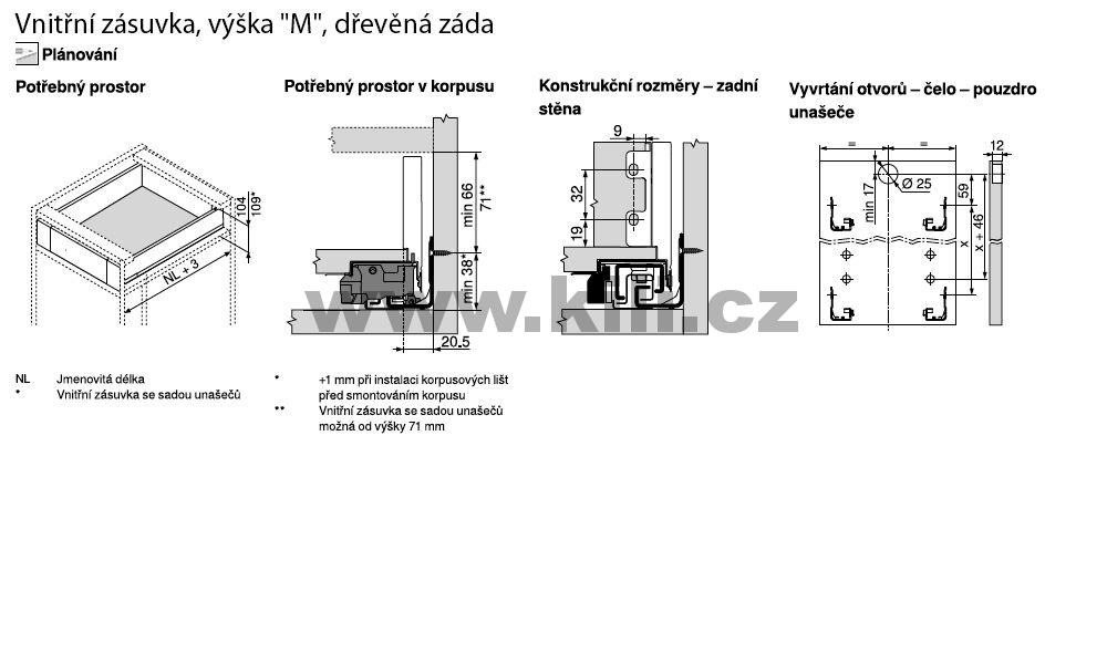 Kompletní vnitřní zásuvka LEGRABOX černá "M" 650 mm 70 kg s tlumením