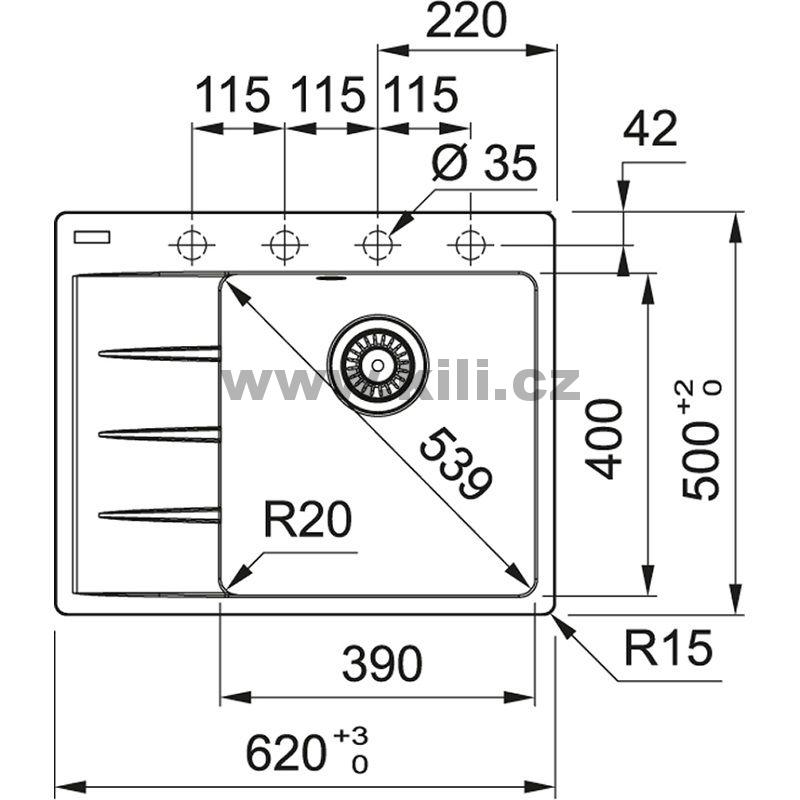 Dřez CNG 611-62 TL/2, 3 1/2" onyx, odkap v pravo, horní