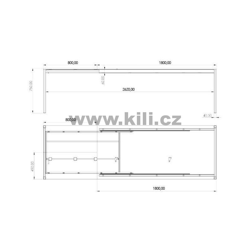 | Specifikace | Výška: 750 mm Šířka MIN: 1800 mm Šířka MAX: 2600 mm Hloubka: 900 mm |