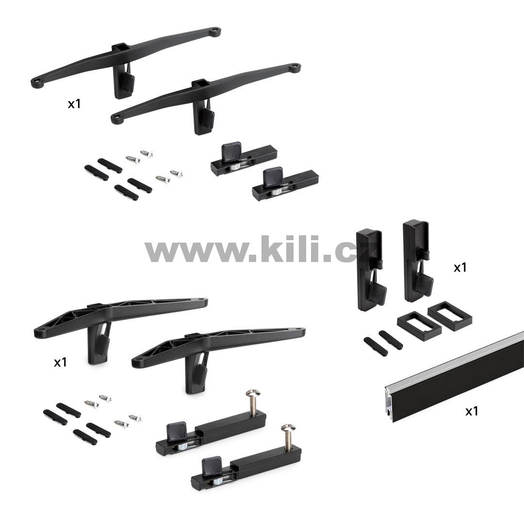 1 sada podpěr pro dřevěnou polici, 1 sada podpěr pro modul, 1 sada podpěr pro závěsnou tyč, 1 závěsná tyč 1 m dlouhá, 8 šroubů O3,5x16, 2 šrouby M6, 2 krytky na tyč, 10 krytů příslušenství a montáž instrukce
