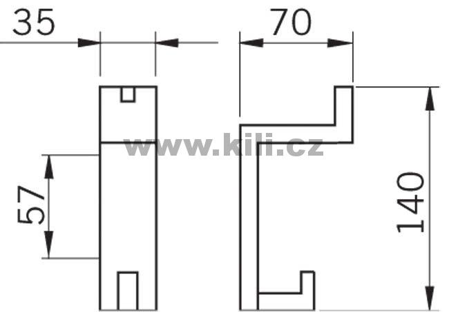 | Specifikace | Výška: 140 mm Šířka: 35 mm Hloubka: 70 mm Rozteč otvorů: 57 mm |