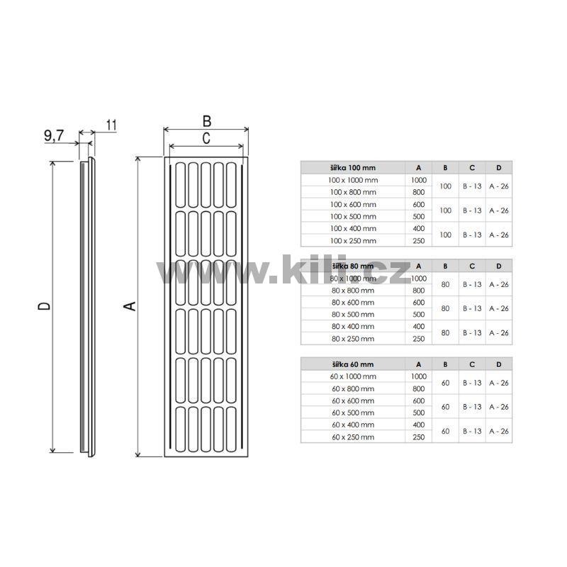 | Specifikace | Délka: 800 mm Výška: 80 mm Hloubka: 11 mm |